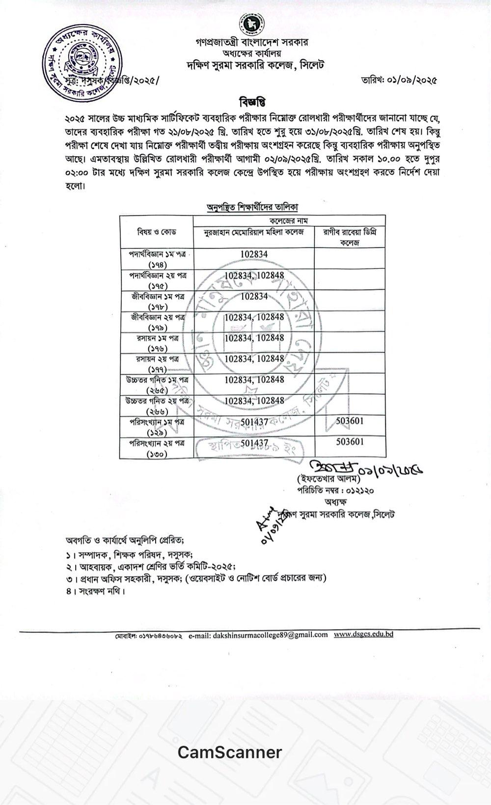 দক্ষিণ সুরমা সরকারি কলেজ কেন্দ্রে ব্যবহারিক পরীক্ষায় অনুপস্থিত শিক্ষার্থী দের তালিকা