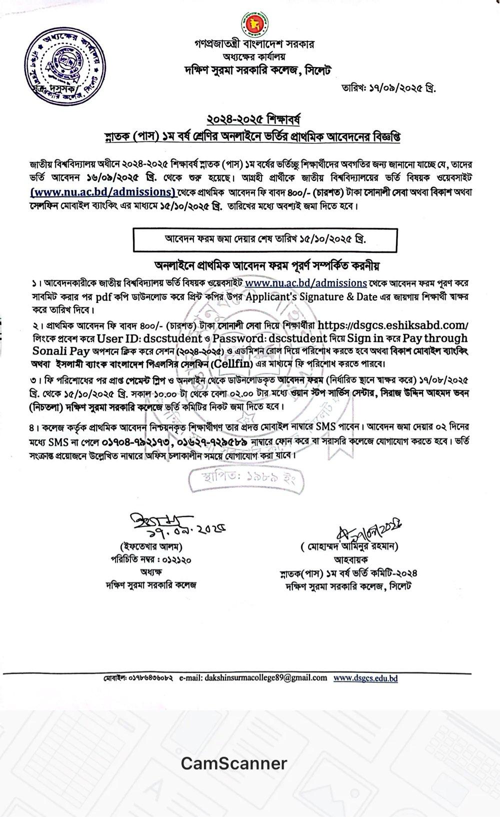 ২০২৪-২০২৫ শিক্ষাবর্ষে স্নাতক (পাস) ১ম বর্ষে ভর্তির প্রাথমিক আবেদনের বিজ্ঞপ্তি