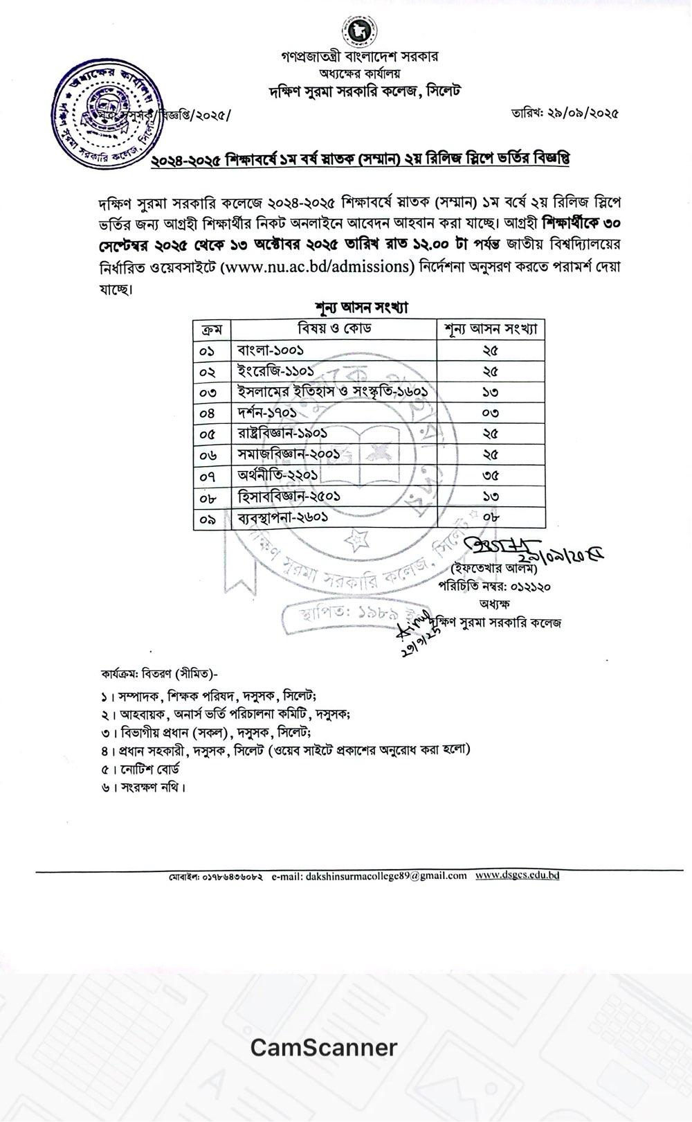 অনার্স ১ম বর্ষে ২য় রিলিজ স্লিপে ভর্তি আবেদনের বিজ্ঞপ্তি